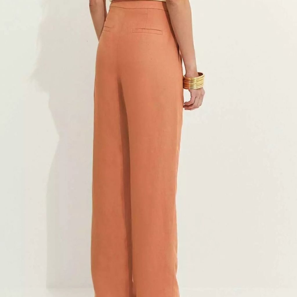 Calça confeccionada em viscolinho, modelo pantalona, toda forrada, bolsos na laterais, bolso de alfaiataria na parte de trás, cós com fehamento em ziper e dois botões forrados.