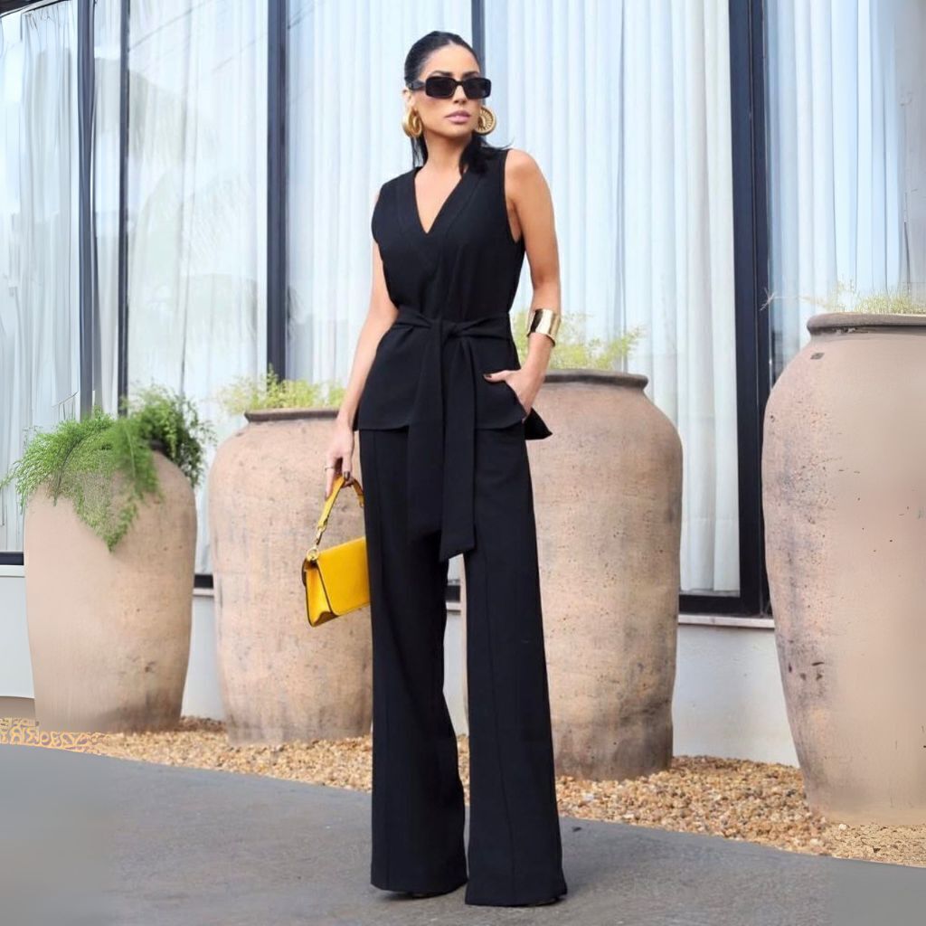Conjunto de calça e tunica. Calça pantalona, fechamento em zíper na parte da frente, cós sem passante, bolsos faca nas laterais e bolsos de alfaiataria na parte de trás. Tunica decote v, com detalhe de pesponto. Faixa de amarração que pode ser usada como cinto ou no pescoço trazendo charme ao look.