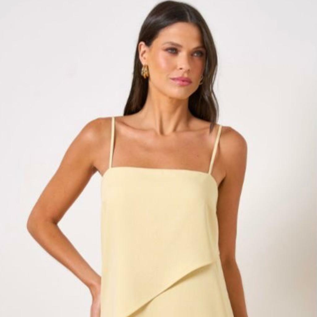 Conjunto composto por saia midi e tunica. Tunica de alcinhas, recortes na frente e atrás. Saia midi com cós e fechamento em zíper invisível na lateral.
