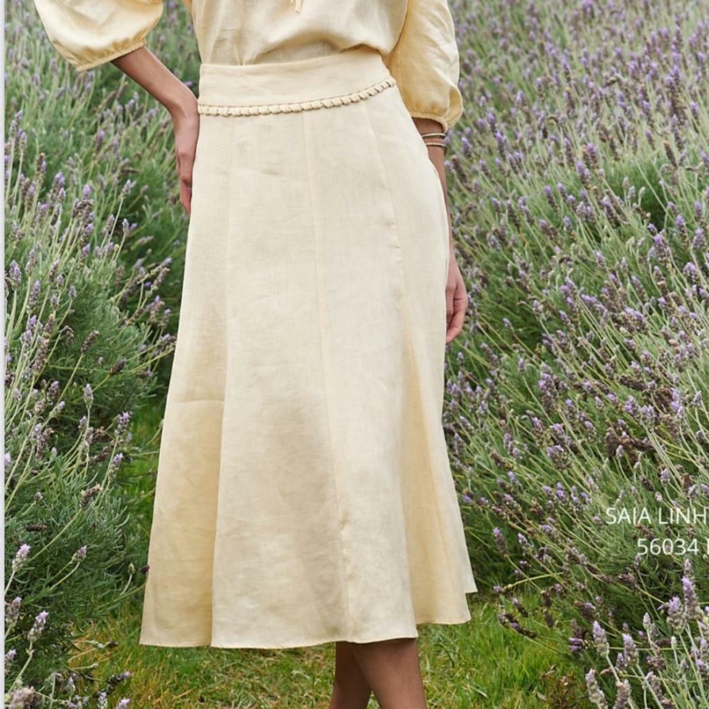 Saia confeccionada em linho natural, formato evasê, comprimento midi, forrada, detalhe trançado no cós, fechamento em zíper invisível na lateral.