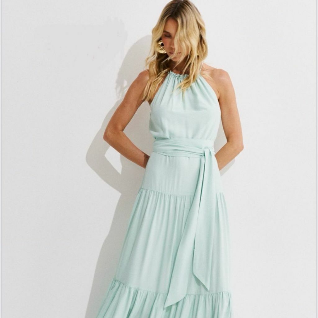 Vestido confeccionado em viscose, decote halterneck, alças finas, acinturado com elástico nas costas, recortes franzidos na saia, forrado, acompanha cinto faixa no mesmo tecido.
