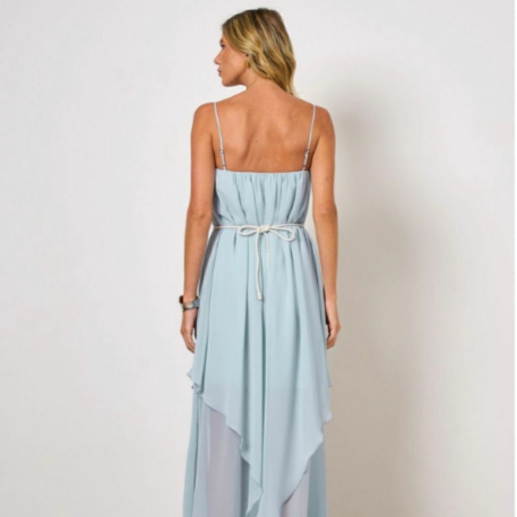Vestido confeccionado em tecido fluido, comprimento longo, alcinhas finas com regulagem, forrado, elástico no decote, com forro no busto. Acompanha cinto corda com detalhes de resina.