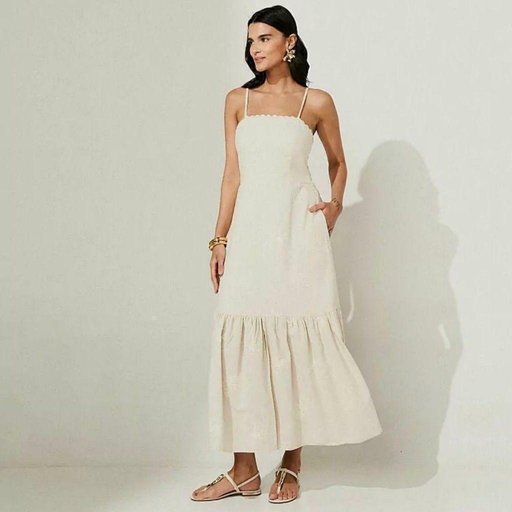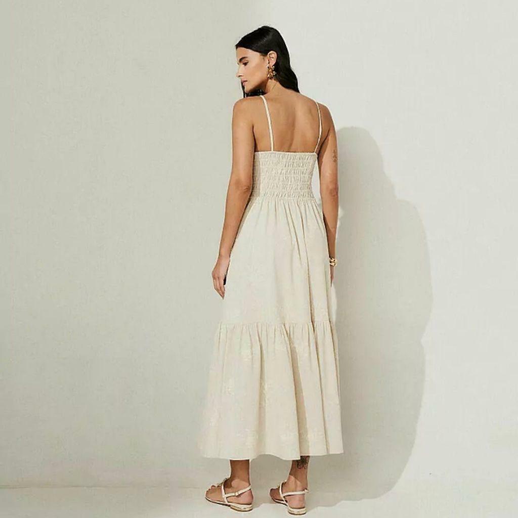 Vestido confeccionado em viscolinho, com bordado, alças finas, comprimento midi, fenda frontal na saia, sianinha em torno do decote, lastex na parte de trás, forrado.